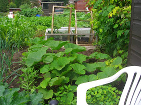 Tucked in between the squashes and courgettes is a marrow.  The squashes did not grow at all during the cold wet weather but now they are romping away. It is amazing what a little warmth will do.  No flowers on them at the moment but I always live in hopes.  Several courgettes have already been harvested.  Lots of flowers but no marrows as yet.